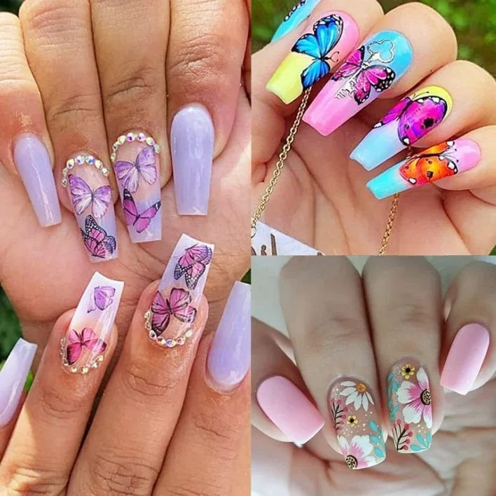 Butterflies are also associated with change hence fitting spring well. A whimsical, dreamy manicure is made up of small butterfly decals or hand-painted wings on the top of a sheer or pastel base.