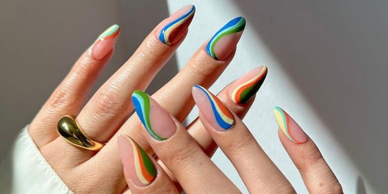 Swirl nail art is a massive hit of the season. The curvy lines are done in soft spring colors such as peach, lavender and baby blue to bring movement and fun.