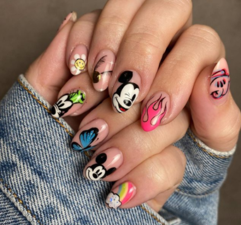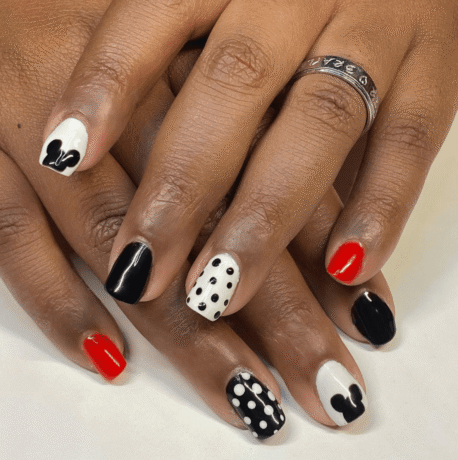 Mickey Mouse is what Disney embodies. The iconic black, red, and white color combinations and popular polka dots or figures are the most common features in classic Mickey-inspired nails.