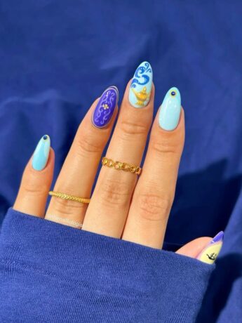 Disney inspired nails with glitter will instantly make them sparkle and glamourize. Glitter star accent nails, magic dust effects, or shimmering details improve the design in general.