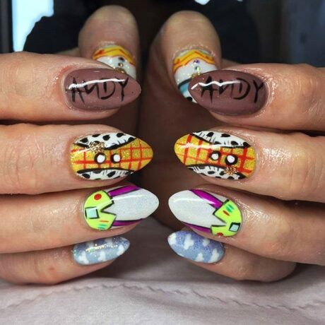 Nail designs that have toy story designs are bright, entertaining, and characterful. Characters in the designs may be Woody, Buzz Lightyear or the whimsical patterns of clouds.